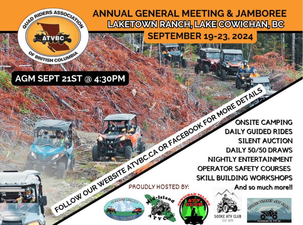 | REGISTRATION Online Registration closes on September 5, 2024. You can also register on-site when you arrive.$10 – per adult (16 years and older) and $5 – per child (15 years and younger) Please register anyone who will be attending the Jamboree (ie. children and/or spouse who are attending even if they do not ride). REGISTER with BCATV ATVBC AGM Please indicate on your registration how many will attend the ATVBC Annual General Meeting on Saturday, September 21, 2024, at 4:30 pm. Check-in for the meeting starts at 4:00 pm. Pizza and beverages will be served, confirmation of attendees needed to properly plan for food volume. O P T I O N S MEALS Breakfast – Friday, September 20, 2024 – $10 per person -Will include bacon, eggs, sausage, pancakes, toast, juice or water Breakfast – Saturday, September 21, 2024 – $10 per person -Will include bacon, eggs, sausage, pancakes, toast, juice or water Dinner – Friday September 20, 2024 – $25 per person -Will include pulled pork sandwiches, macaroni & cheese, and coleslaw -Dinner is being provided by The Brazen Fork https://www.thebrazenfork.com/ CAMPING at Laketown Ranch (no hookups-dry camping) Camping rates = $45 per site if staying for only one night $35 per site if staying only two nights $30 per site if staying for three or more nights All rides will leave directly from the campgrounds and you will not have to trailer your ATV. Arrivals begin Thursday, Sept. 19th 2024 Laketown Ranch Camping Rules Cookstoves, propane fire pits and BBQ’s MUST be 12 in (30 cm) off the ground at all times. ABSOLUTELY NO WOOD FIRE PITS OR CHARCOAL COOKING DEVICES. You must have a fire extinguisher at your campsite if you are using a cook stove, BBQ or propane fire pit. Pets are allowed but must be on a leash at all times. Pets are not allowed in the food area. Failure to keep a clean campsite WILL result in eviction from grounds. No household furniture permitted. Climbing on any structures, trees, RV’s (with the exception of repairs), fences, etc., may lead to eviction from grounds. Generators must be shut down from 12am to 8am. Obey campsite quiet times. Campsites must be left clean and vacated by 11am the day after the event. Campers who do not demonstrate care for self, others or the environment WILL be told to leave the campground and will have their camping passes revoked without a refund. Camping at Laketown Ranch is a privilege. Dangerous or obnoxious behaviour will NOT be tolerated. OTHER ACCOMMODATIONS See other Lake Cowichan accommodations here |