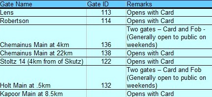 The fobs only open two gates (Chemainus Main (4km) and Holt Main)